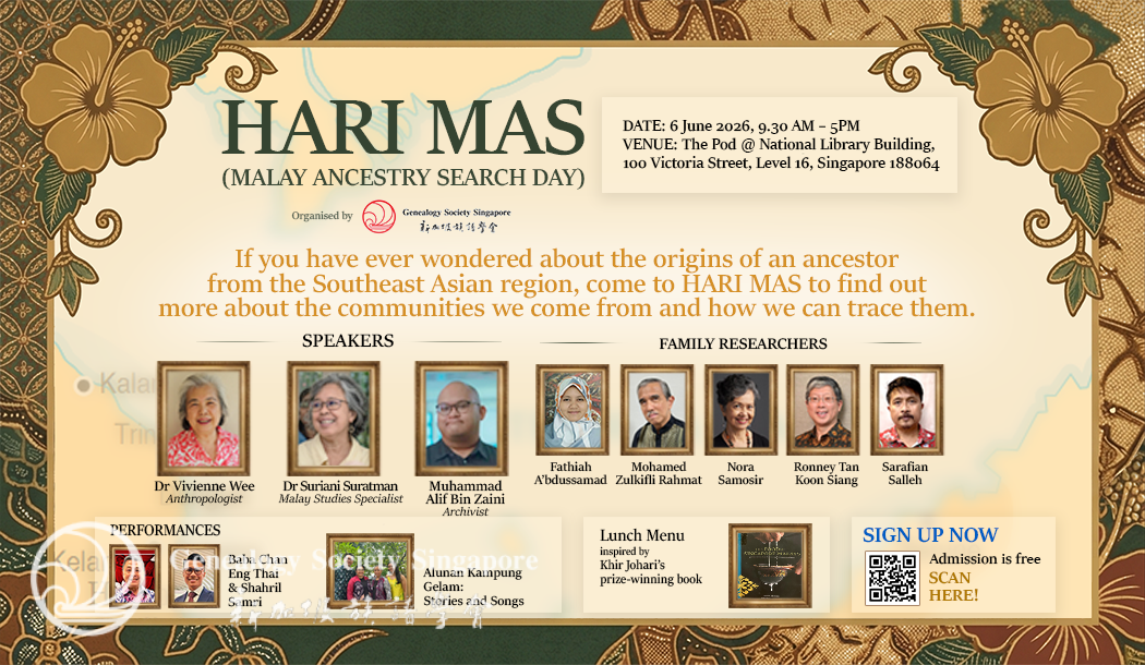 All seats for Hari MAS have been filled. For those who secured seats, we look forward to seeing you at Hari MAS on 6 June! For those who haven’t, please stay tuned to the GSS website for the post-event video. We wish you all the best with your ancestry search journey.